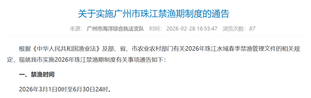 根据《中华人民共和国渔业法》及部、省、市农业农村部门有关2026年珠江水域春季禁渔管理文件的相关规定,现就我市实施2026年珠江禁渔期制度有关事项通告如下: