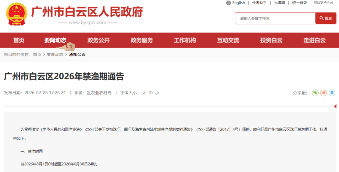 《广州市白云区2026年禁渔期通告》